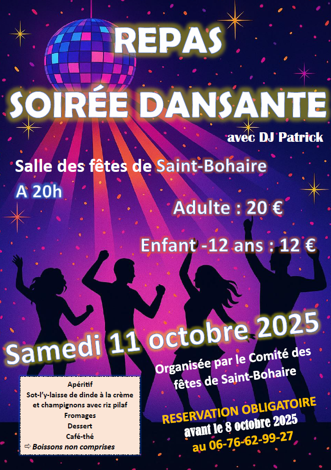 Le Comité des fêtes organise une soirée dansante animée par un DJ avec repas (apéritif, sot-l’y-laisse de dinde crème/champignons avec riz pilaf, fromages, dessert, café-thé)