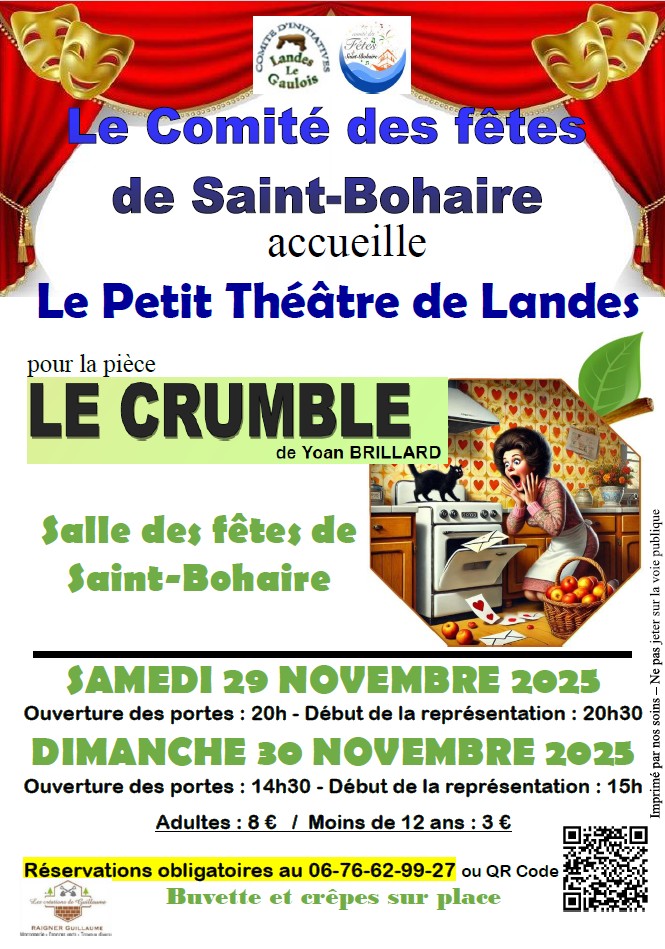 Le comité des fêtes de SAINT-BOHAIRE accueille le petit théâtre de Landes-le-Gaulois pour sa représentation théâtrale de la pièce Le Crumble !